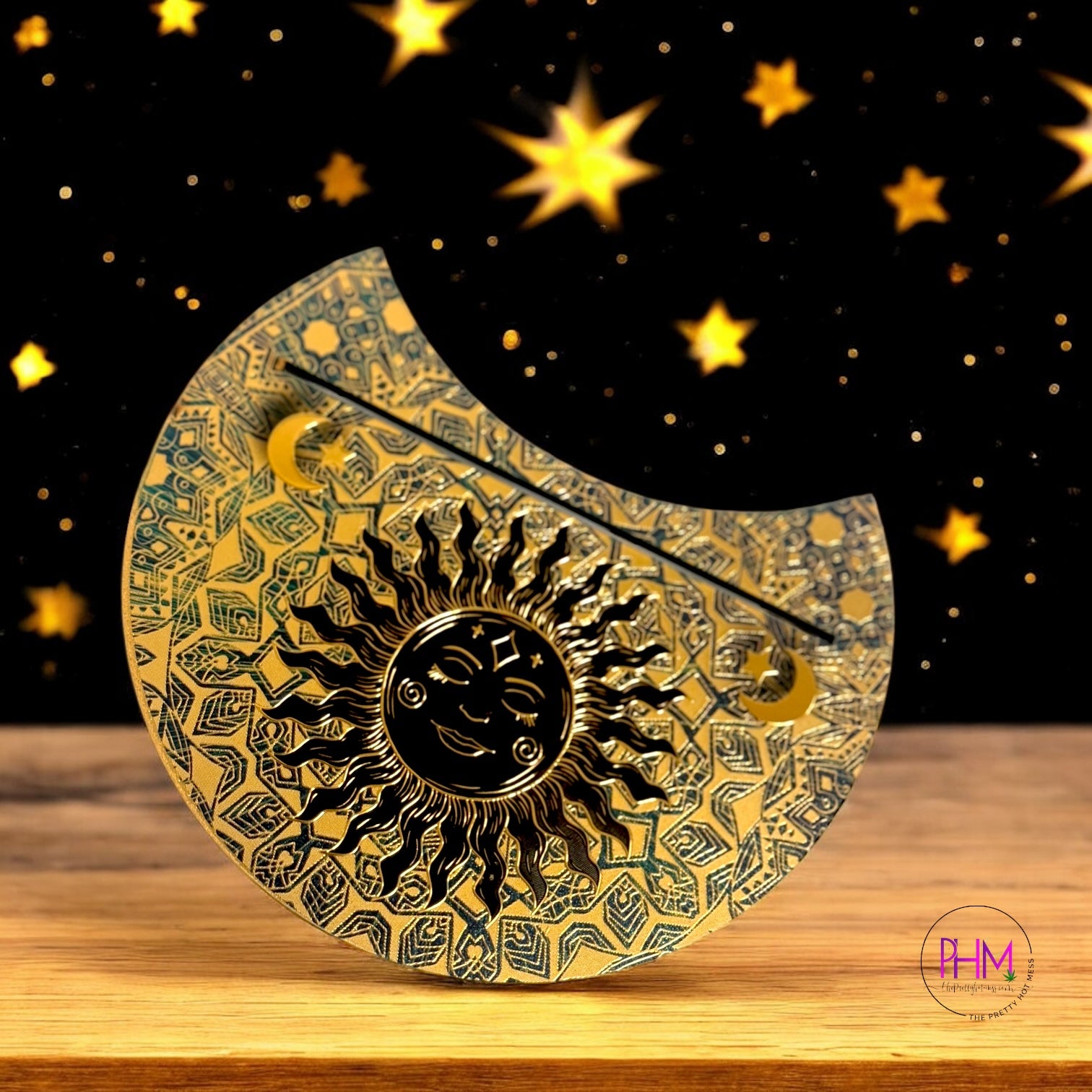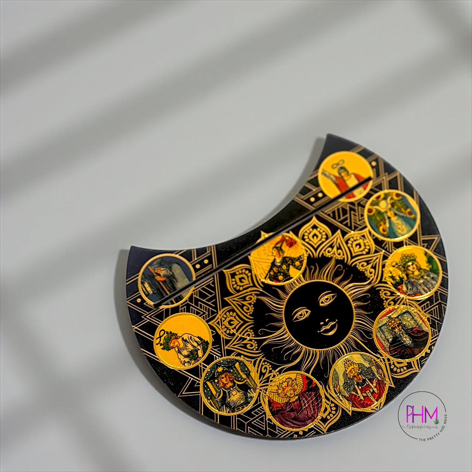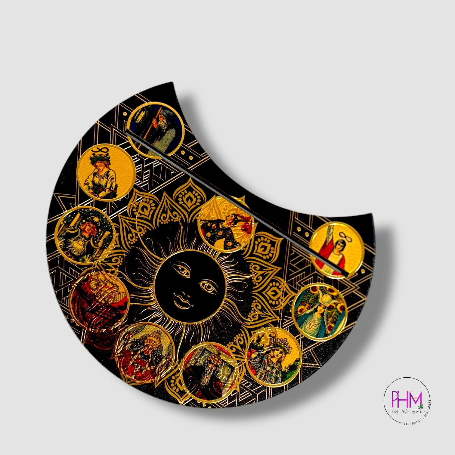 🌙 Crescent Moon Disc (5") – Perfect for displaying a single tarot card with moon phase detailing that channels divine feminine energy and cosmic balance.