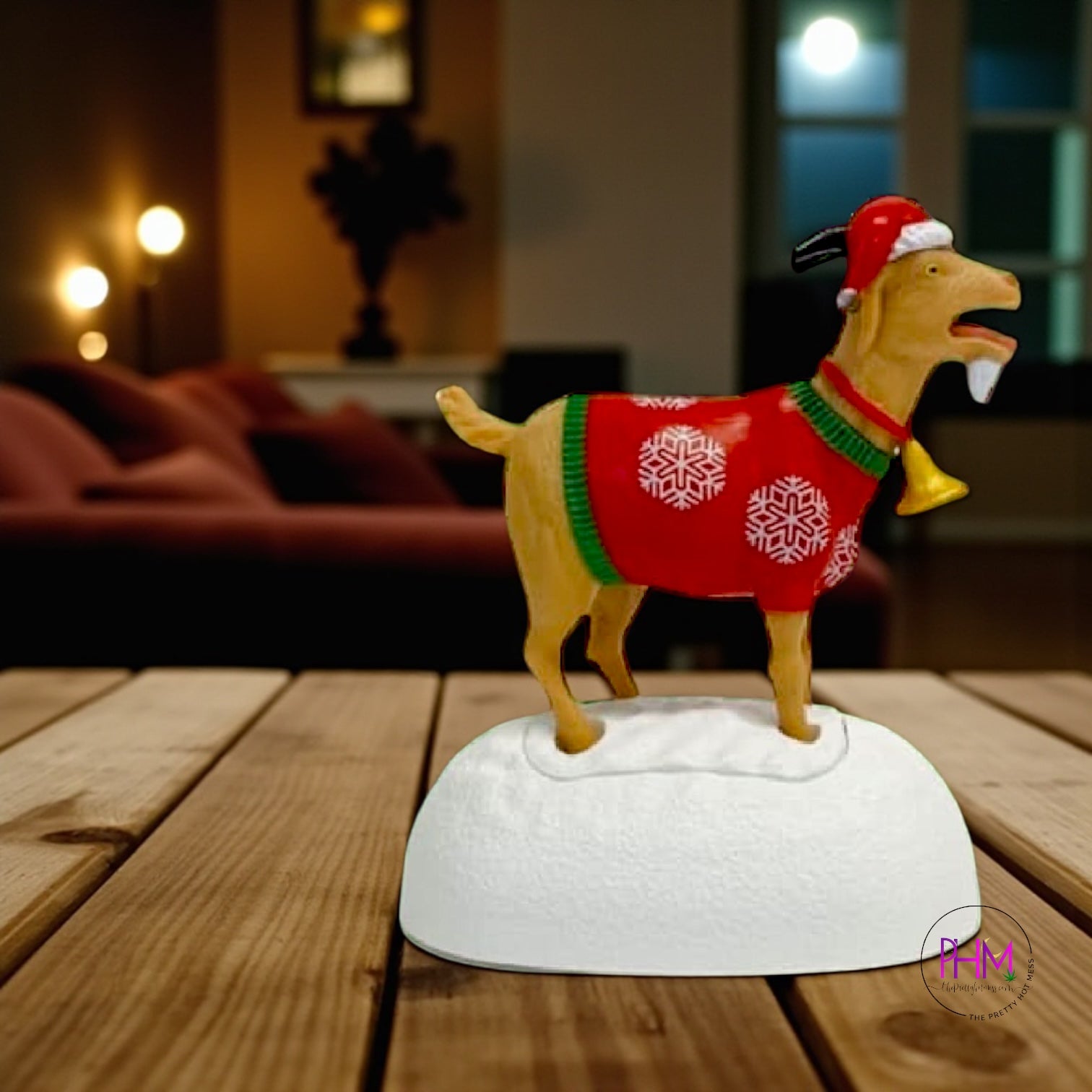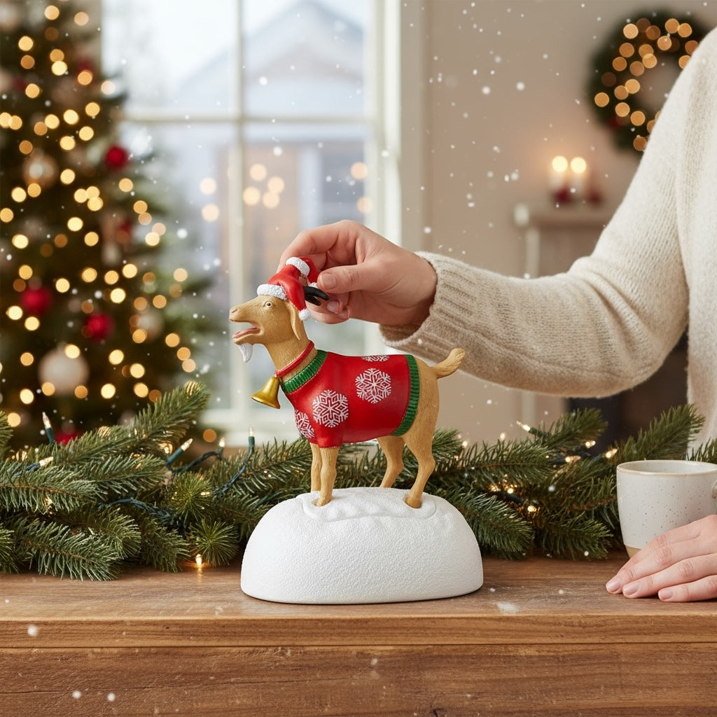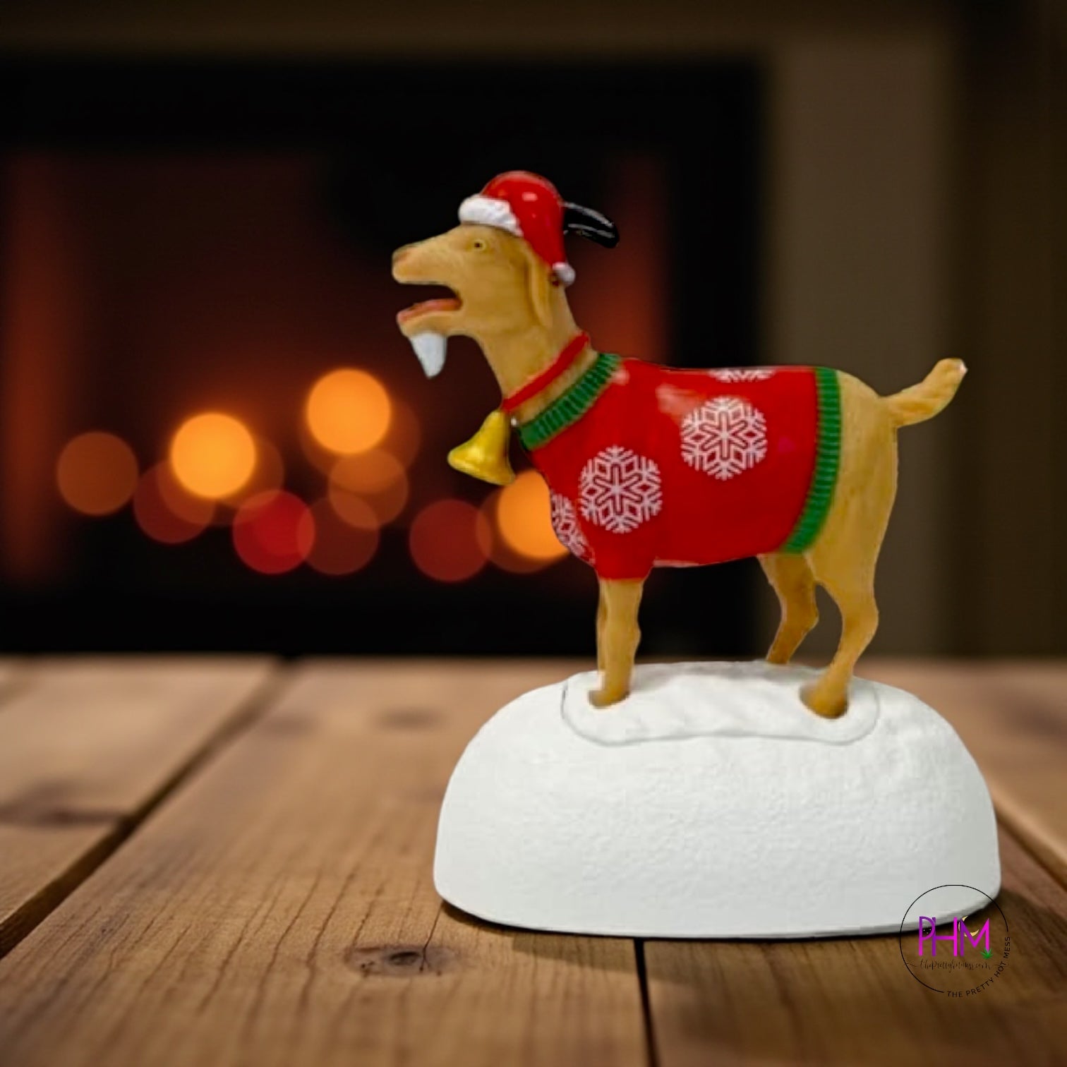 • 3" Christmas goat figurine in sweater, Santa hat & jingles