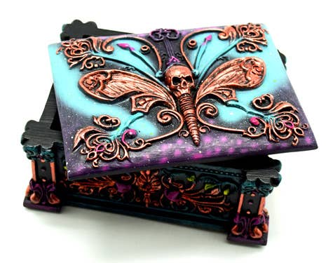 Dark, dramatic, and beautifully eerie — just how we like it. This hand-painted cold cast resin box features an intricate death moth design that gives serious gothic altar energy without trying too hard.