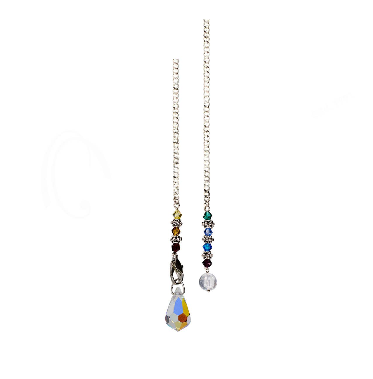 This stunning pendulum features a faceted AB crystal teardrop, designed to catch and reflect light while amplifying intuitive energy. The pendulum is finished with a chakra-beaded chain, representing alignment, balance, and energetic flow from root to crown. Measuring approximately 10.5–11 inches, it offers the ideal length for comfortable, controlled pendulum work.