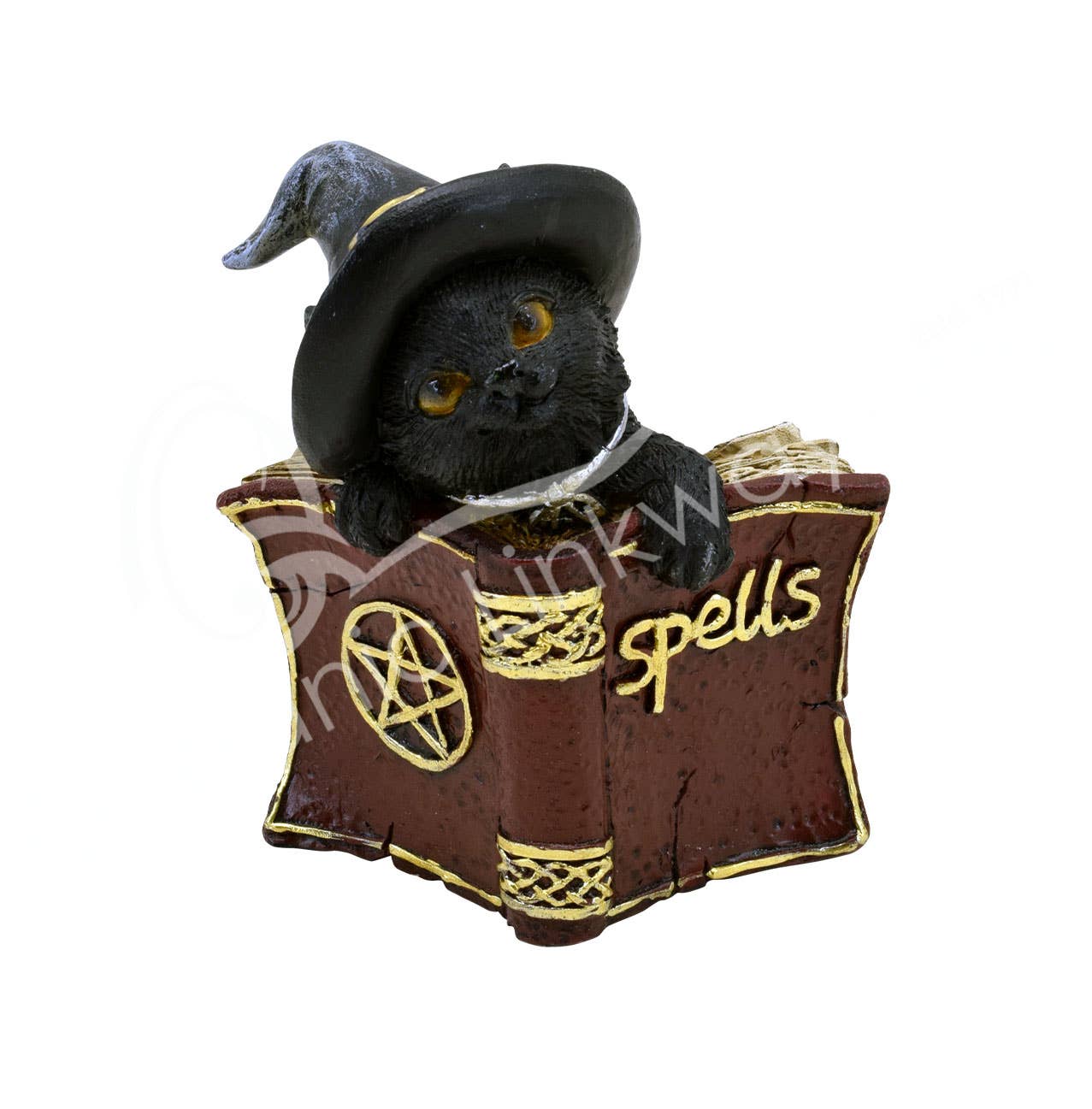 Black cat statue holding a magic book