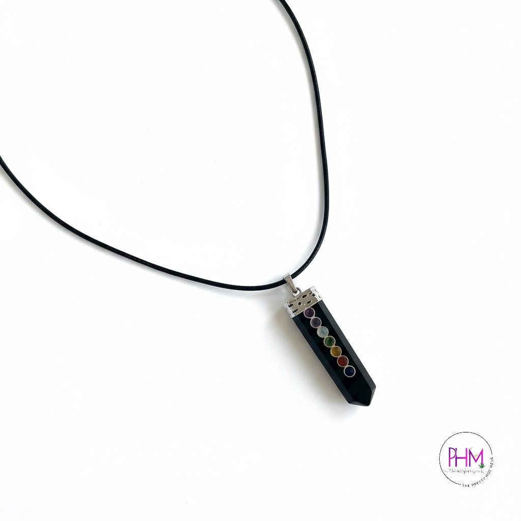 Each pendant features seven genuine chakra crystals aligned to promote balance from Root to Crown: