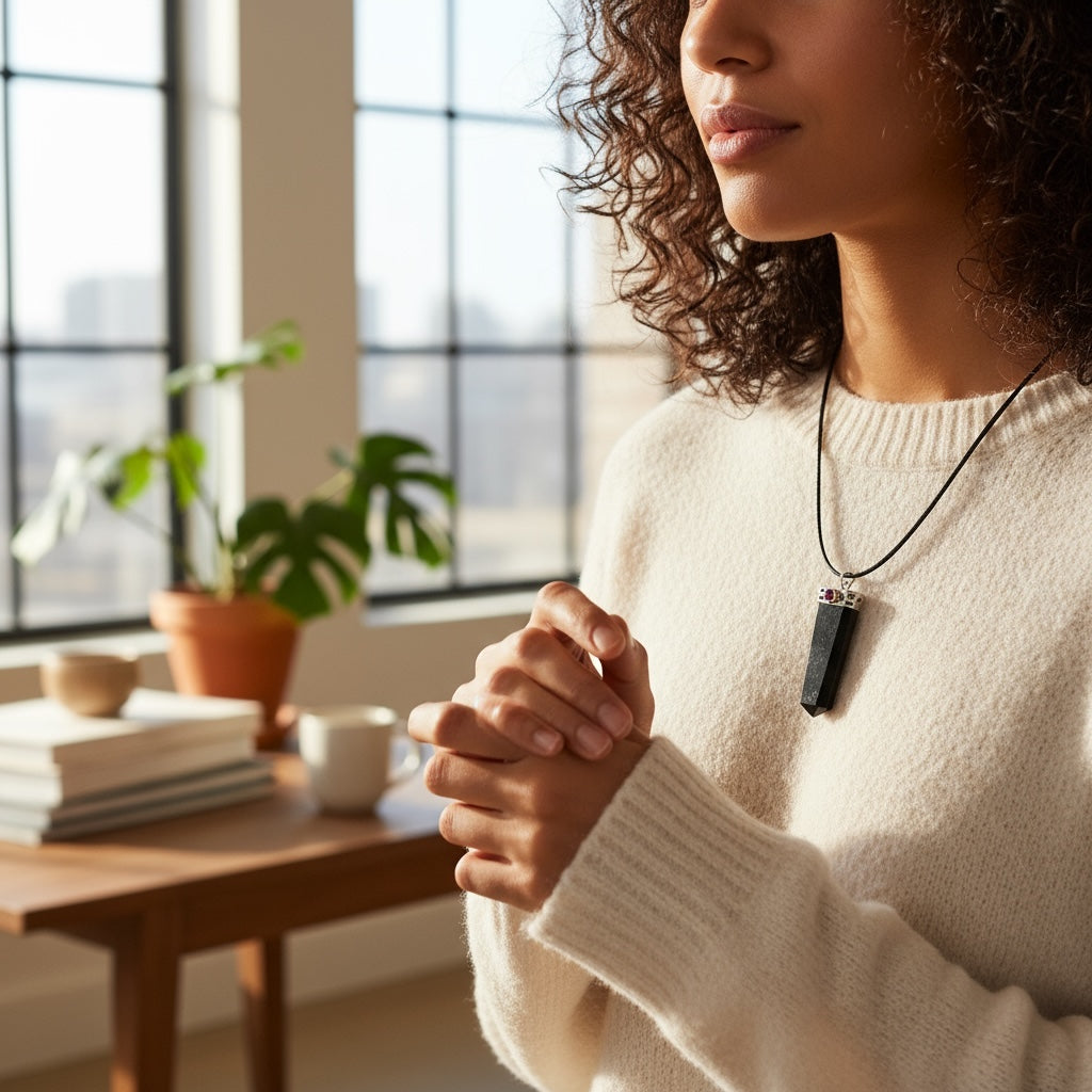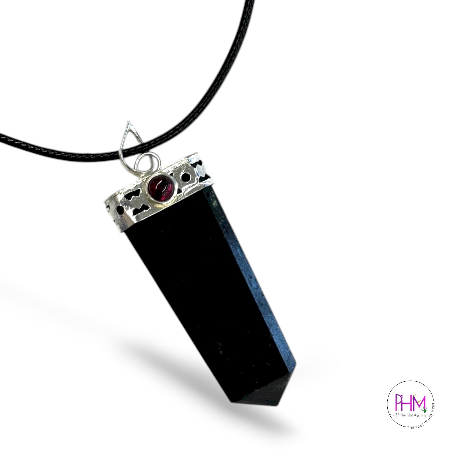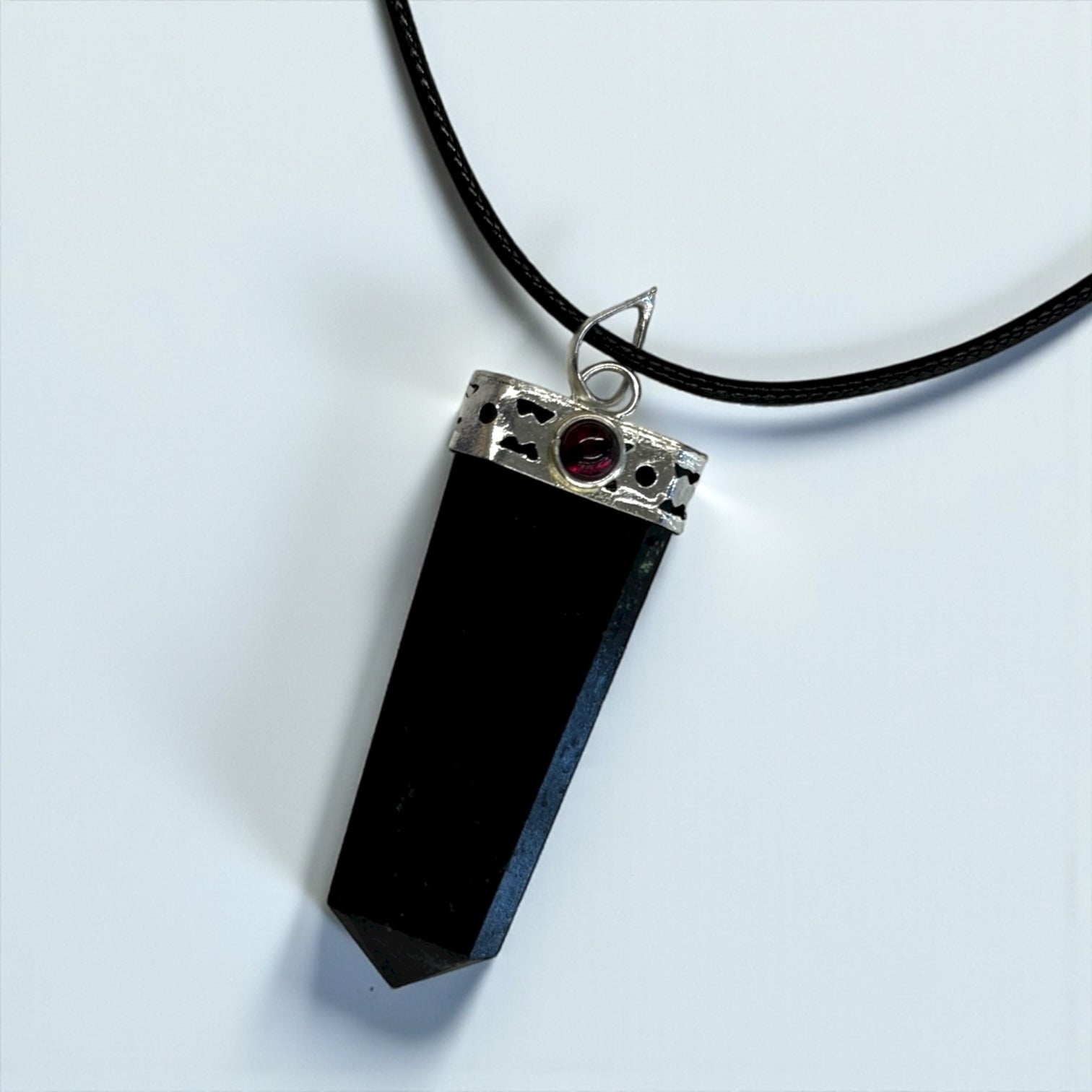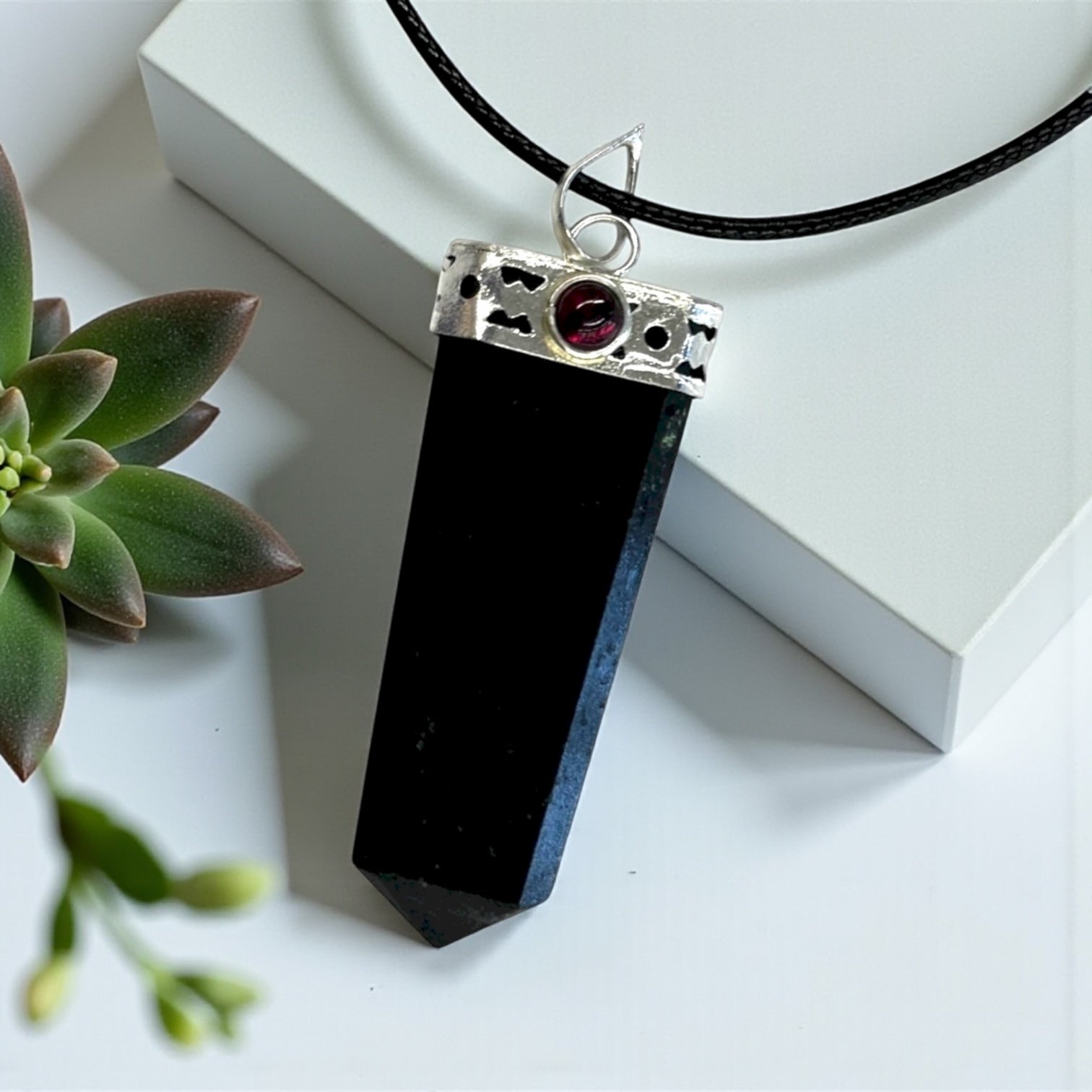 This striking piece features a genuine Black Tourmaline point, revered as the ultimate protector against negative energy, psychic attacks, and emotional drain. Anchored within its sterling silver setting glows a deep crimson Garnet, symbolizing the spark of vitality and courage that burns even in the darkest of times.