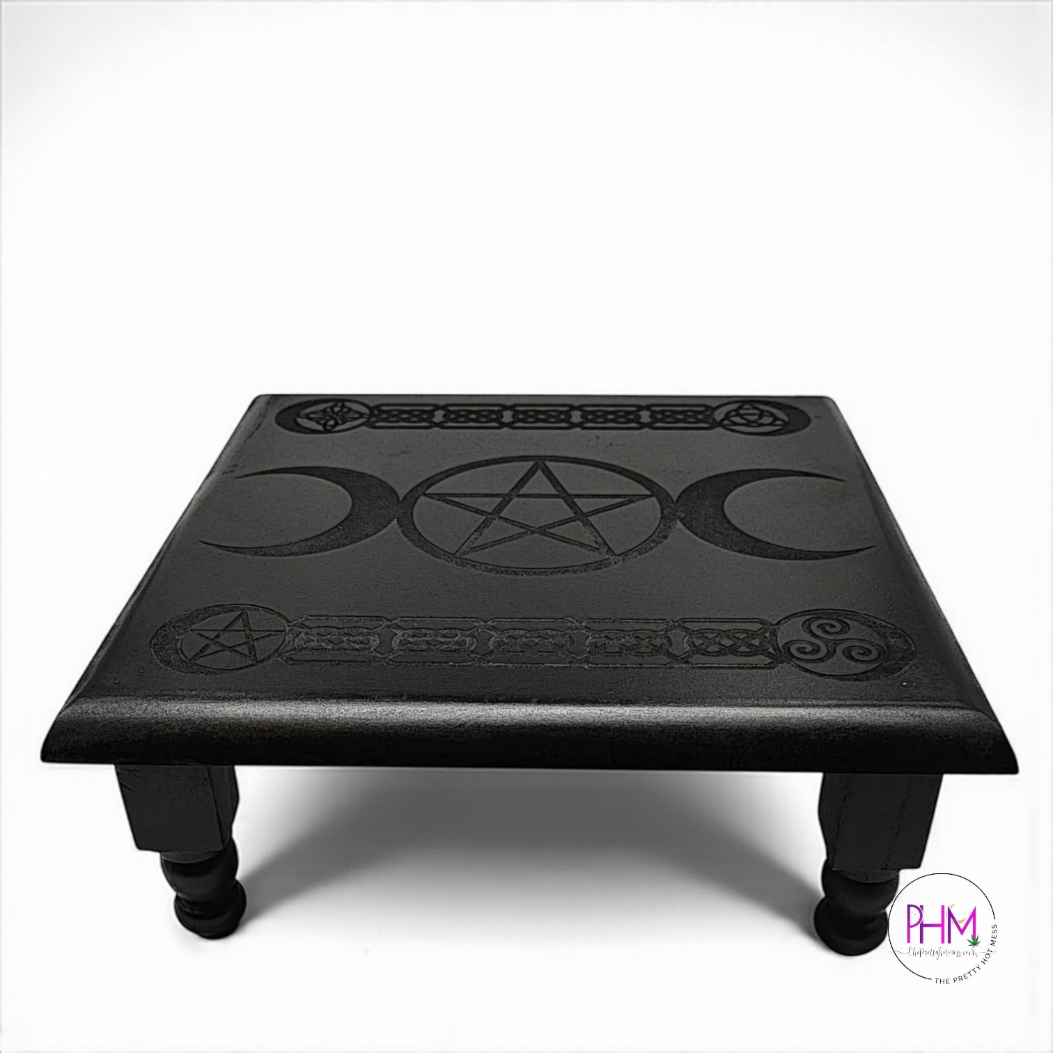 Channel balance, power, and sacred energy with the As Above So Below Triple Moon Altar Table—a stunning hand-carved wooden piece designed to anchor your spiritual practice. Crafted with intention, this altar is etched with both the Triple Moon Goddess symbol and a Pentacle, uniting the divine feminine with protection and elemental harmony.