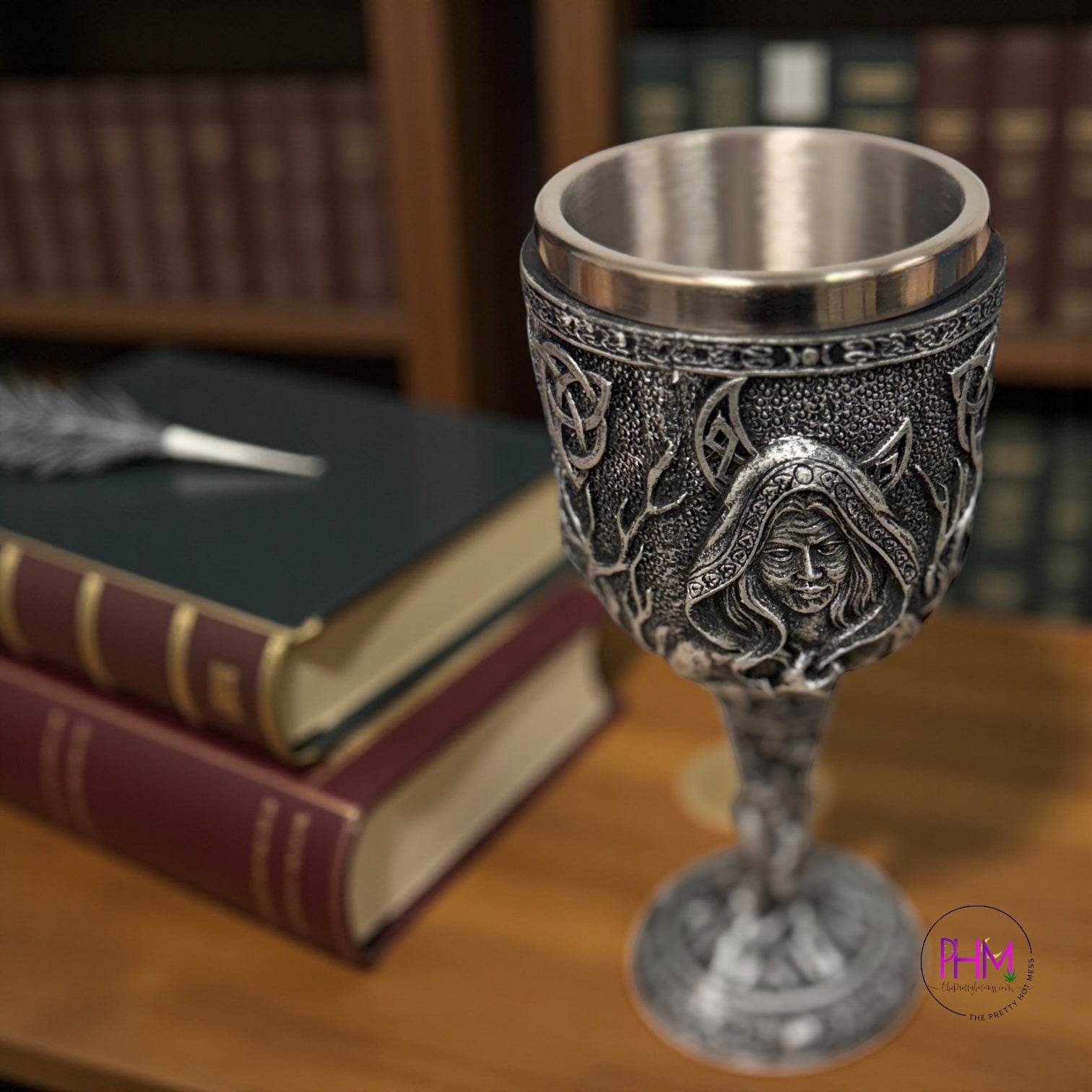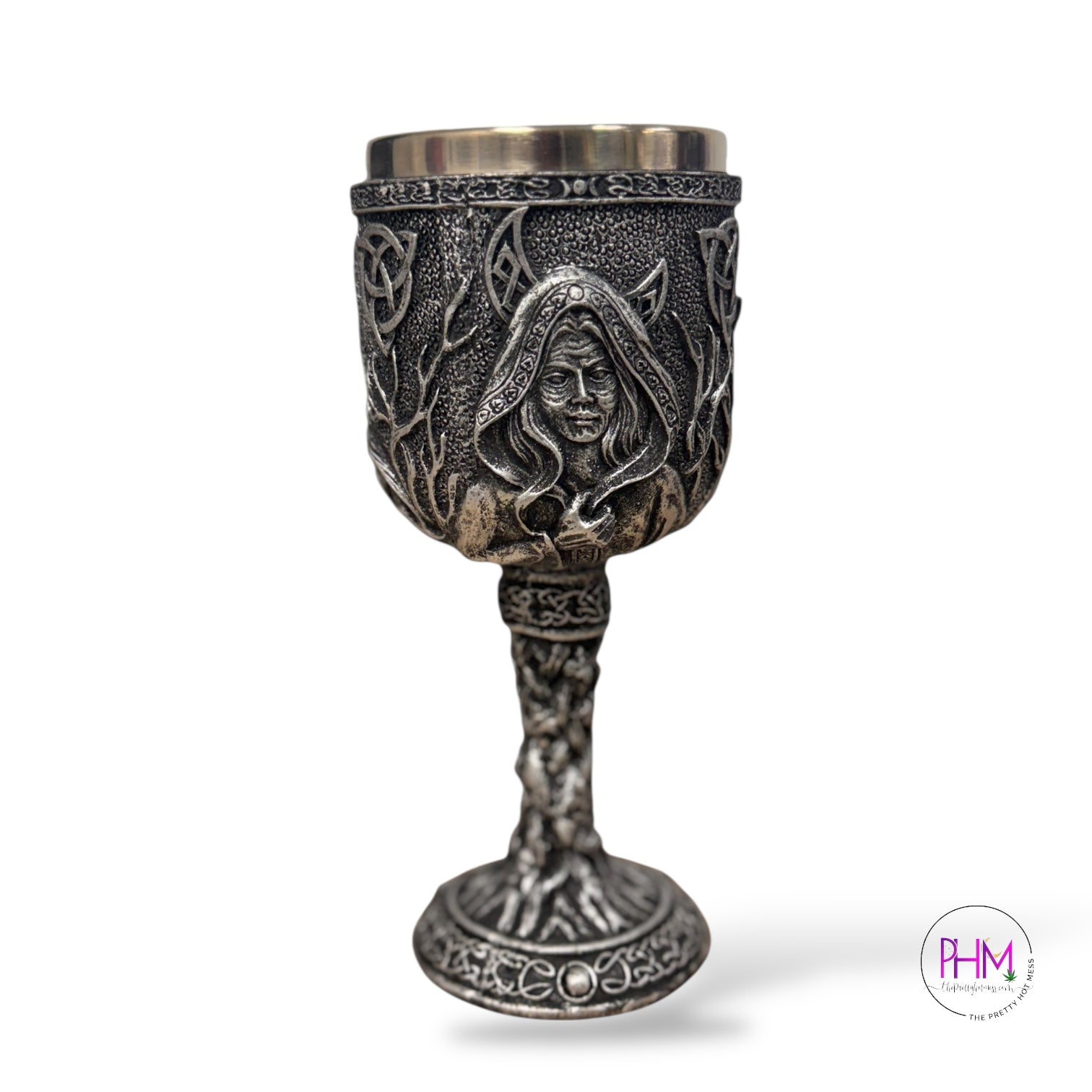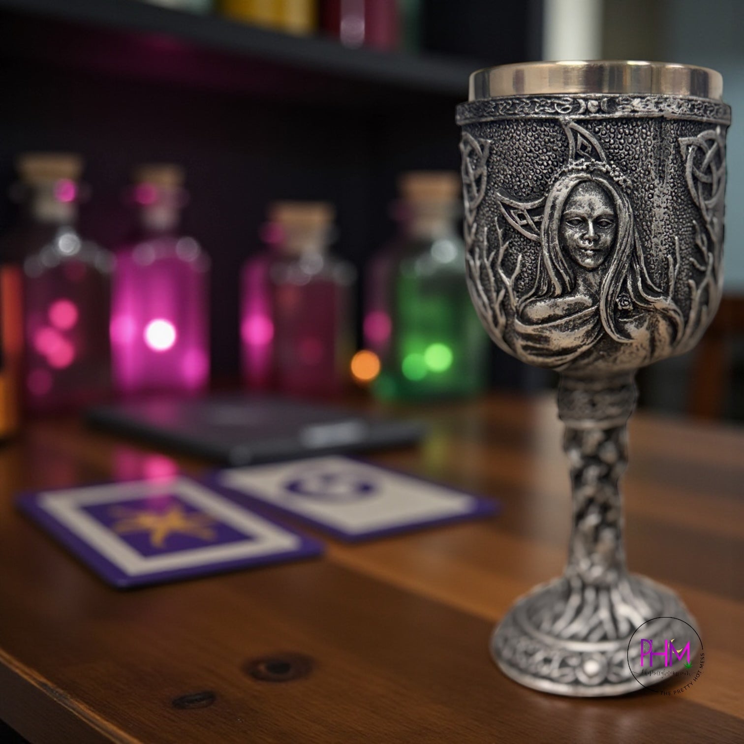 In Wiccan and witchcraft traditions, the chalice embodies the element of Water, reflecting the flow of intuition, emotion, and divine creation. Whether you use it in rituals, moon ceremonies, spellwork, or as an altar centerpiece, this chalice invites the Goddess’s energy to flow freely through your sacred space.