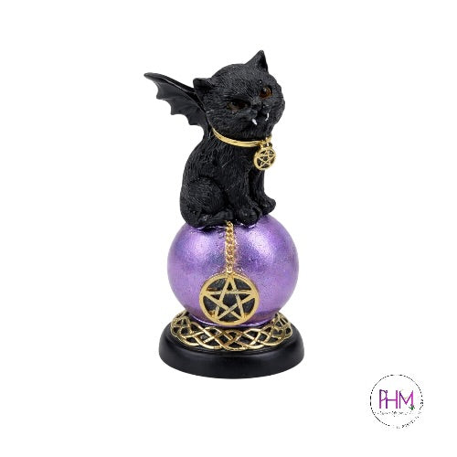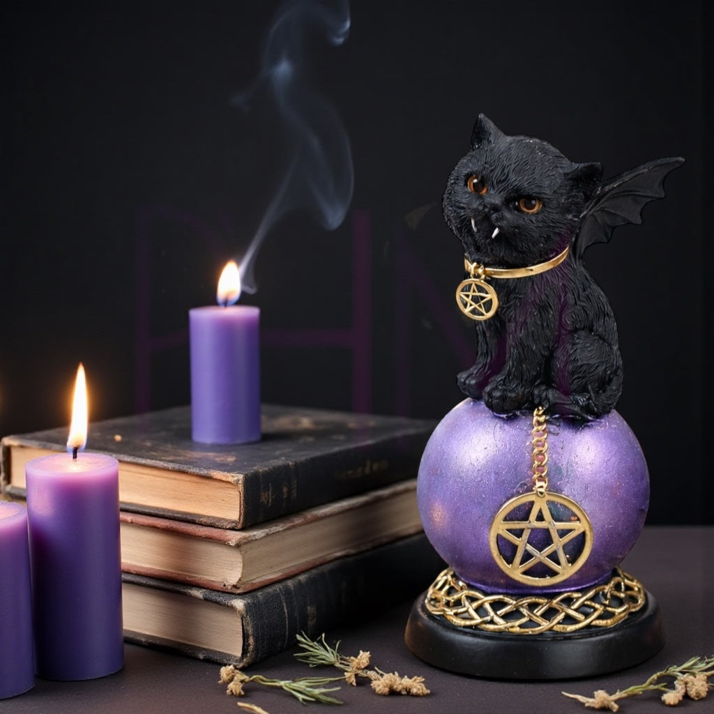 This enchanting black cat statue features a sleek feline perched atop a glowing purple sphere, giving full-on familiar-meets-fortune-teller vibes. Measuring 1.95” L x 1.80” W x 4.45” H, it’s perfectly sized for altars, shelves, desks, or anywhere you want a pop of magical personality without taking up much space.