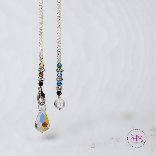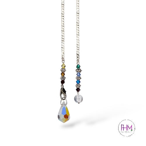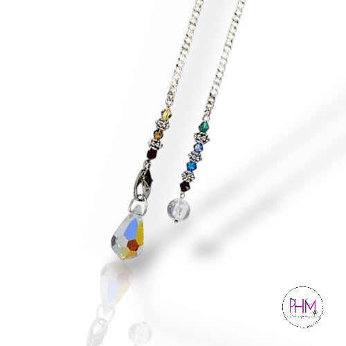 This stunning pendulum features a faceted AB crystal teardrop, designed to catch and reflect light while amplifying intuitive energy. The pendulum is finished with a chakra-beaded chain, representing alignment, balance, and energetic flow from root to crown. Measuring approximately 10.5–11 inches, it offers the ideal length for comfortable, controlled pendulum work.