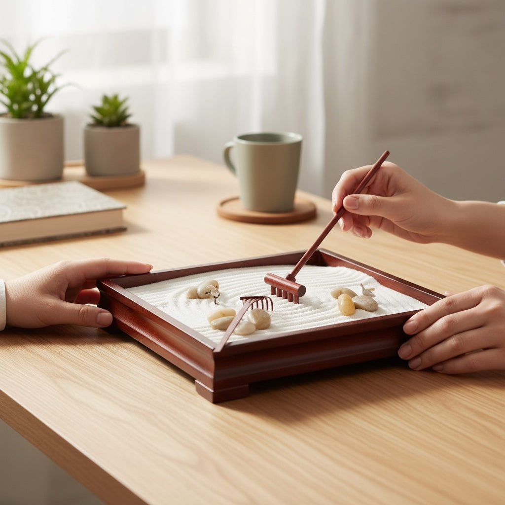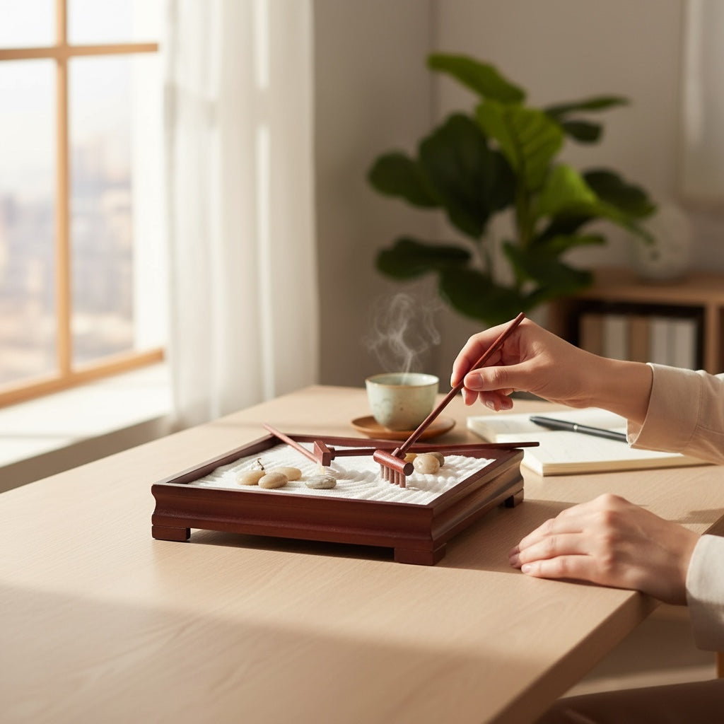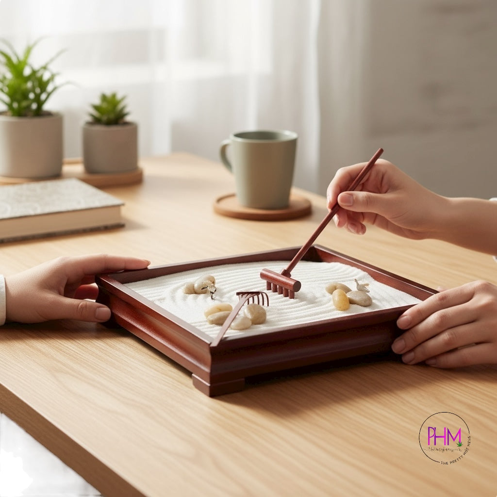 Each beautifully designed set features pristine white sand nestled inside a rosewood-finished box 🪵, along with all the mindful tools you need to sculpt serenity: a long-handled wooden rake, a bamboo rake, a small broom, two delicate ceramic cranes 🕊️, and a selection of polished stones 💎. A meditation booklet is included to spark inspiration and guide your mini mindfulness ritual. 🧘♀️🌸