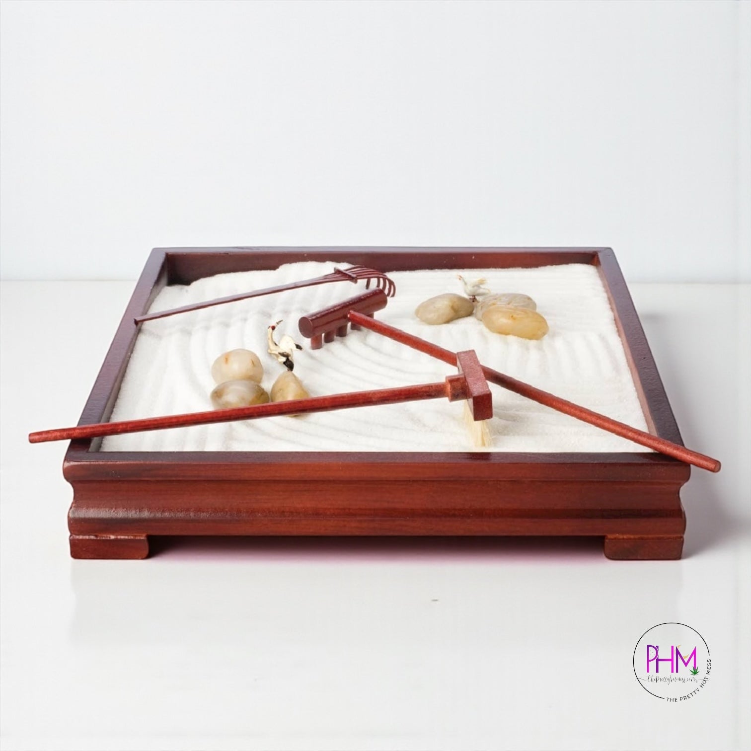 🪷 Includes: White sand, 1 long-handled wooden rake, 1 bamboo rake, 1 broom, 2 mini ceramic cranes & assorted polished stones