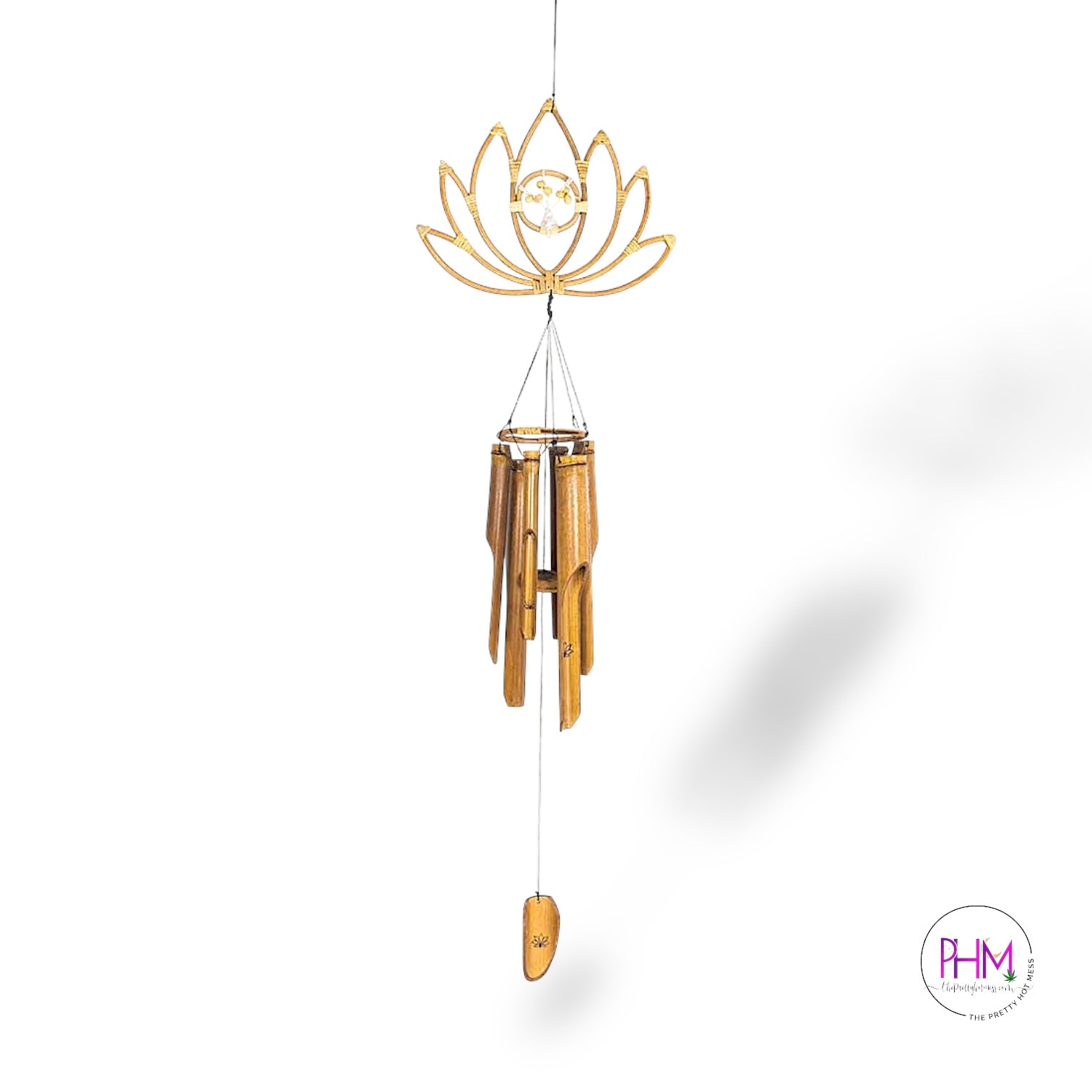 This sustainable bamboo wind chime features a beautifully carved lotus flower, symbolizing purity, rebirth, and rising above the BS (yes, even the cosmic kind). Hanging below is a delicate beaded Tree charm, bringing in grounding energy, stability, and deep earthy vibes — basically the energetic equivalent of standing barefoot in the moss during a full moon. 🌕🌳✨