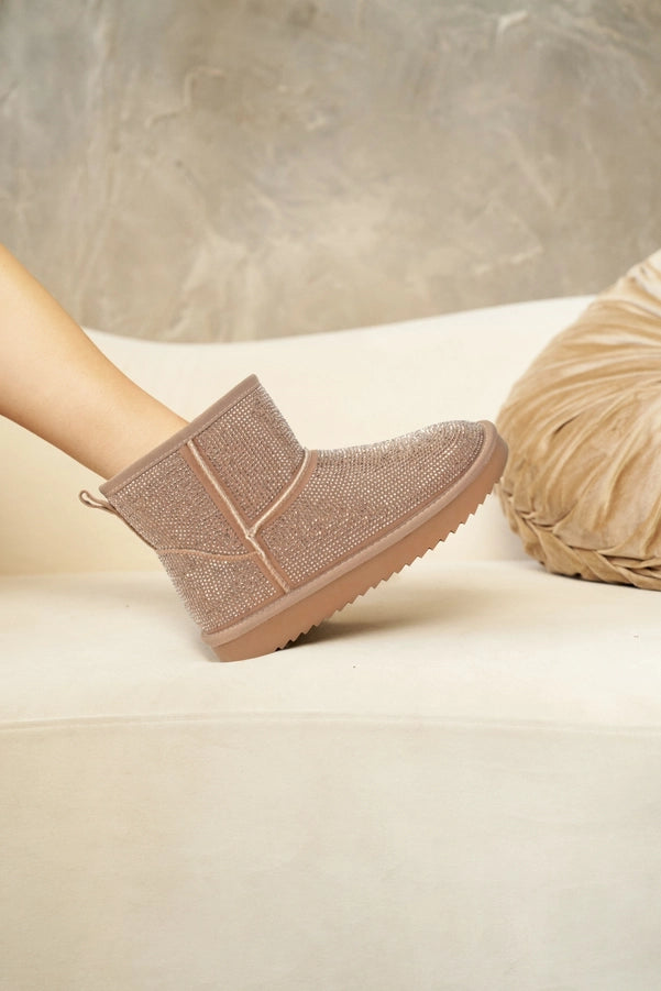 Designed in a classic UGG-style silhouette, the Presley Booties feature a plush sherpa fur lining that keeps your toes toasty and a dazzling bedazzled exterior that catches every flicker of light. Whether you’re running errands or rocking a coffee date, these beauties bring the perfect blend of comfy + boujee.