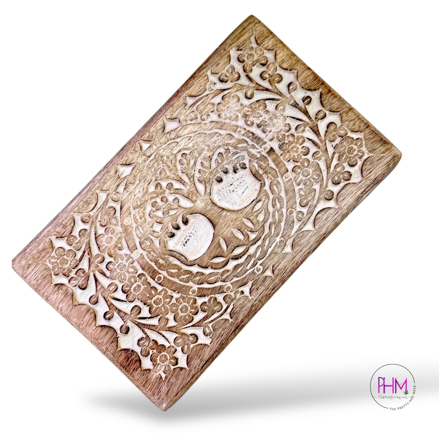 Expertly carved from eco-sustainable mango wood, this solid box features a deeply engraved Celtic Tree of Life surrounded by graceful floral patterns. The distressed antique finish enhances the natural warmth and texture of the mango wood, creating a piece that feels both earthy and sacred.