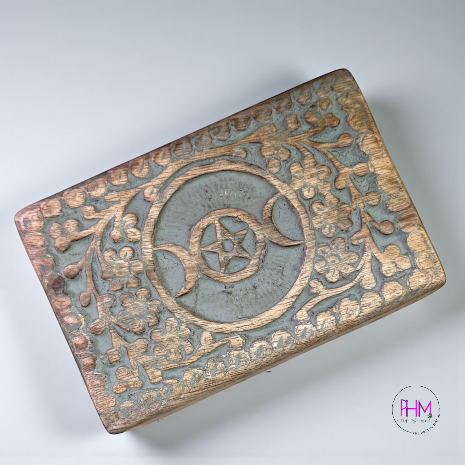 Each box is skillfully handcrafted from eco-sustainable mango and recycled wood, blending durability with natural beauty. The deep Triple Moon carving adorned with delicate floral details radiates mystical charm, while the distressed finish gives each piece an authentic, antique look that complements any sacred space or home décor.