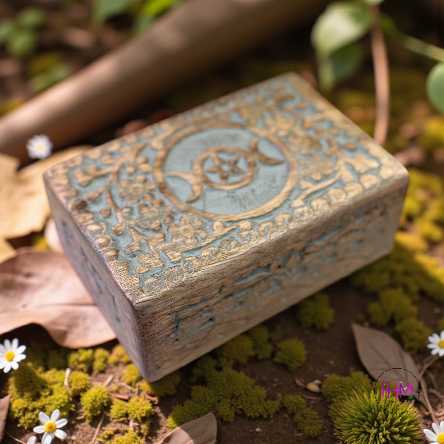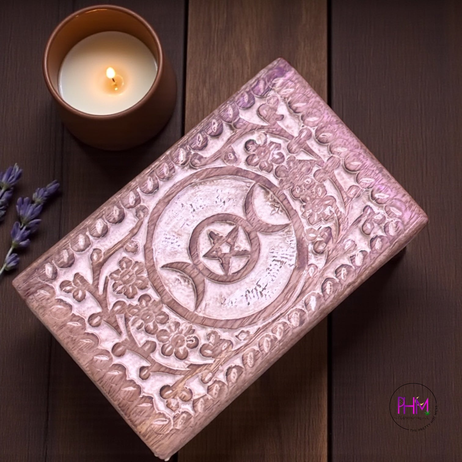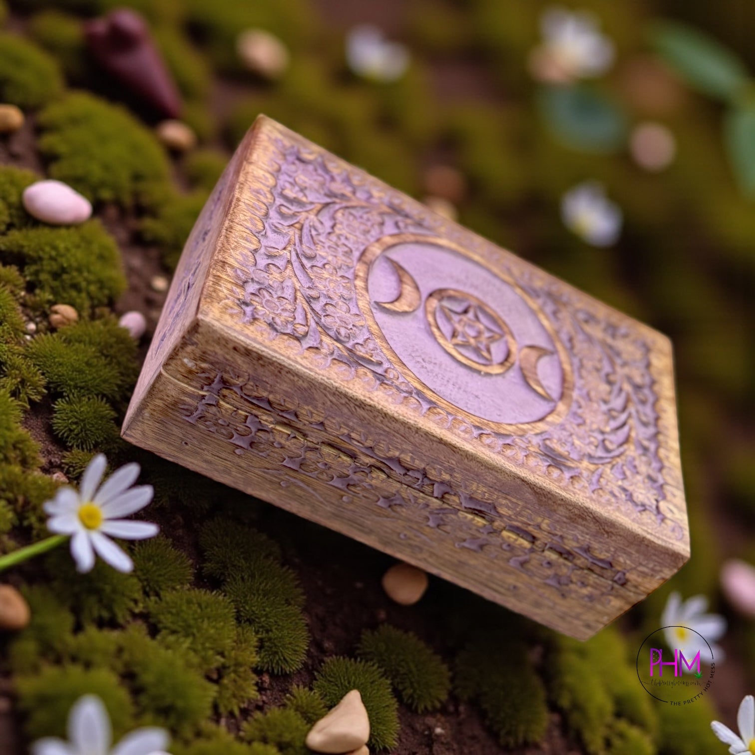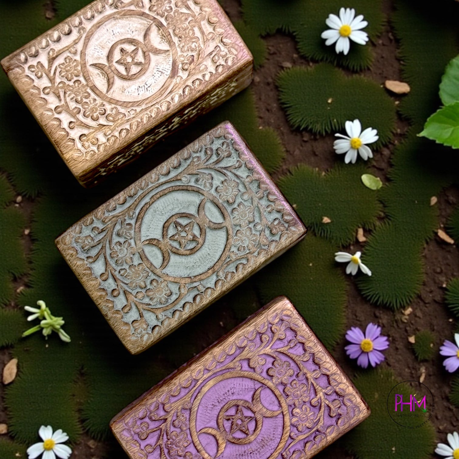Perfect for storing crystals, jewelry, herbs, tarot cards, or other spiritual treasures, these boxes embody both function and magick. The Triple Moon symbol represents the divine feminine and the cycles of life — a reminder of your connection to the moon, intuition, and inner power.