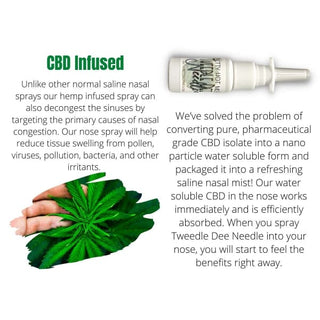 This nutrient-rich nasal spray is designed to soothe, hydrate and protect against environmental pollutants, bacteria, viruses and other irritants that can trigger sinus tissue swelling. With its purest-grade hemp oil plus select herbs, root extracts, and therapeutic oils like Pine Needle Oil, Tweedle Dee's unique formula helps strength the immune system’s natural defenses while offering maximum decongestion. Our hemp infused pine needle nasal spray gently cleans and moisturizes your sinus tissue while providing support to help you naturally resist viruses, dust, smoke, pollen, and excessively dry air.