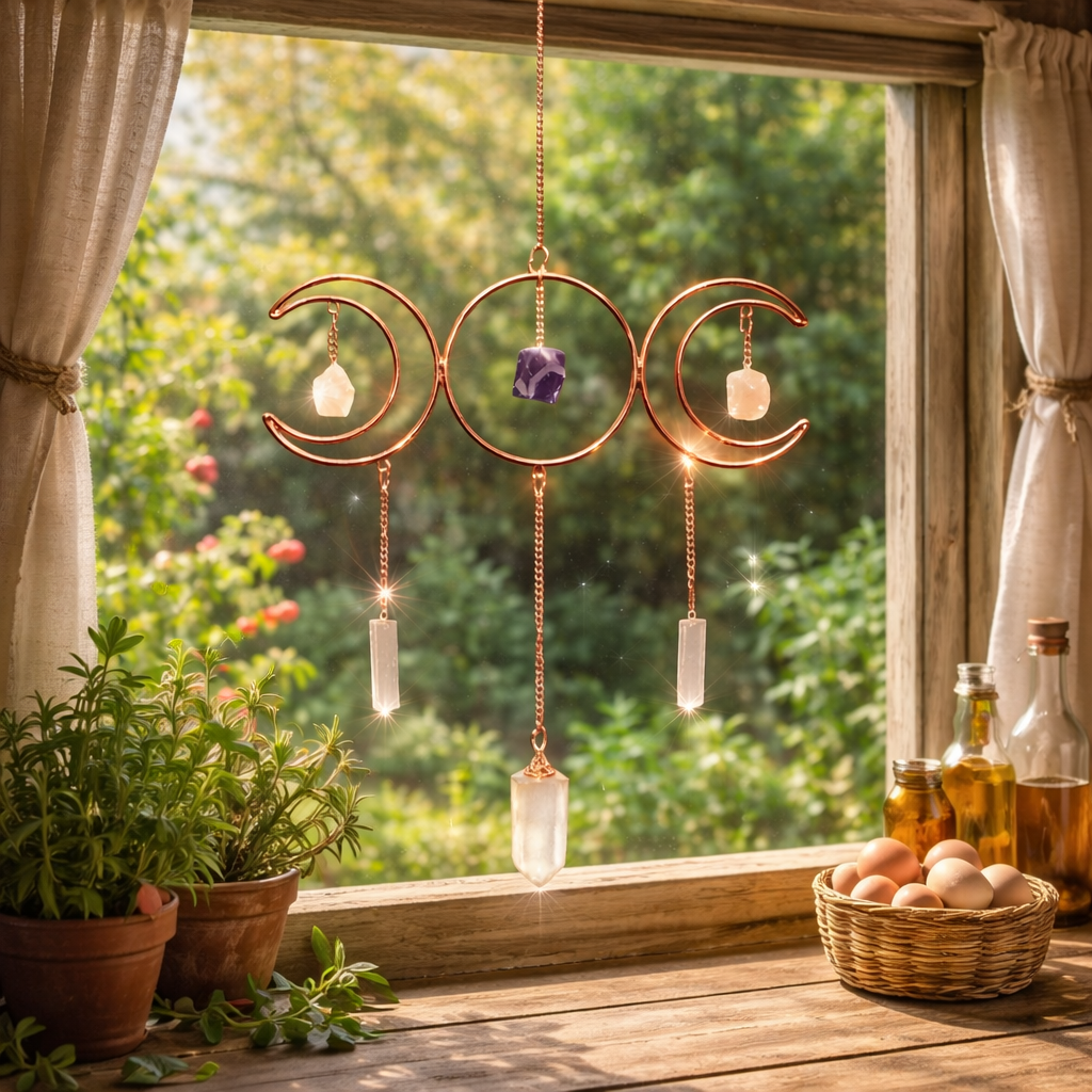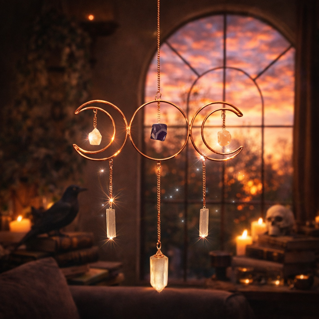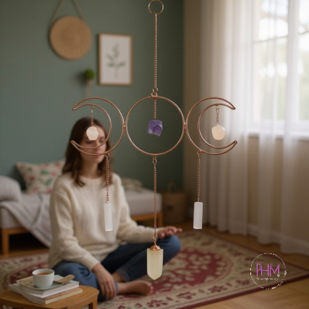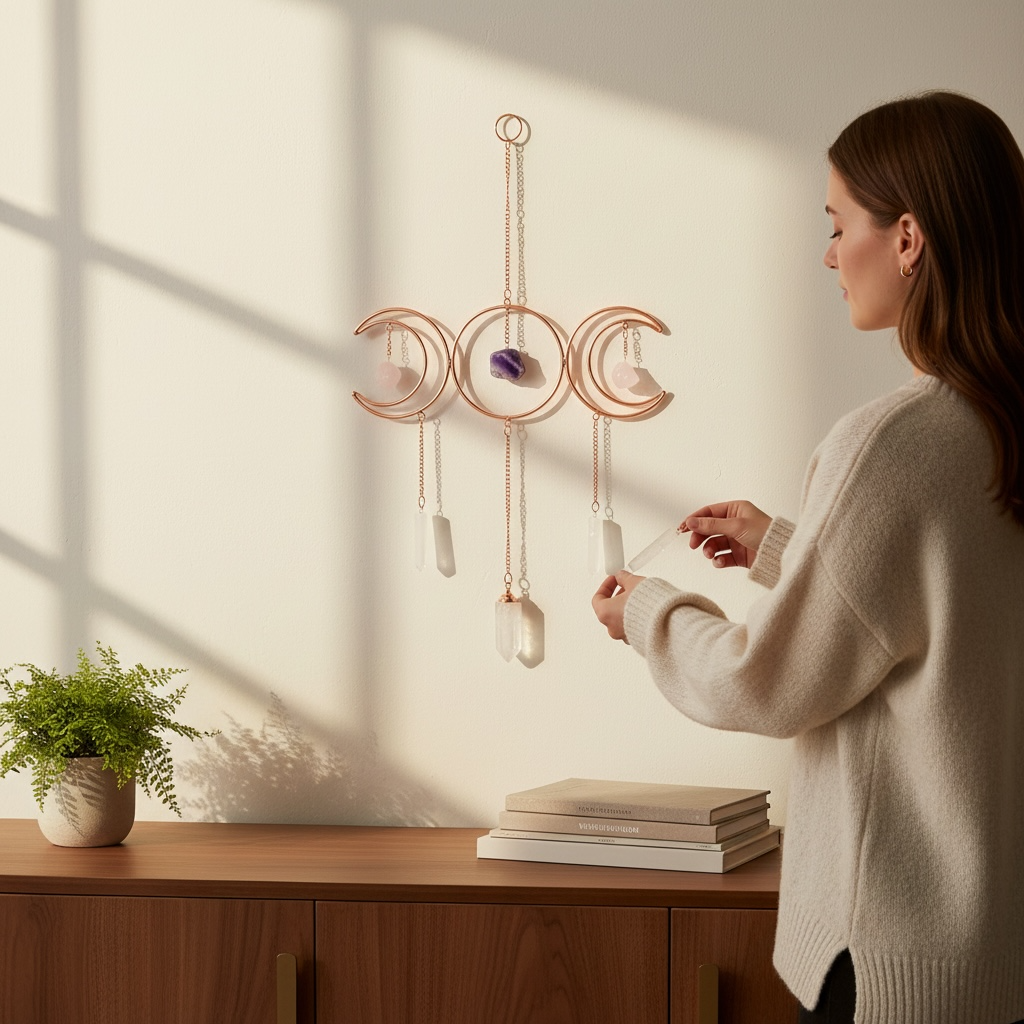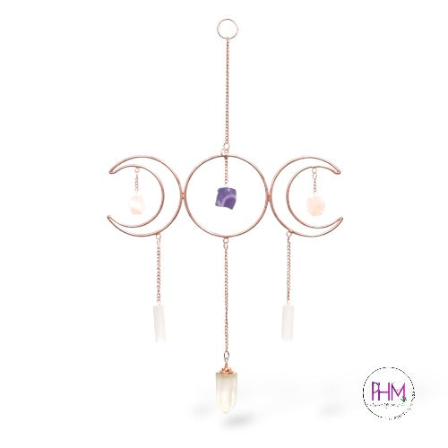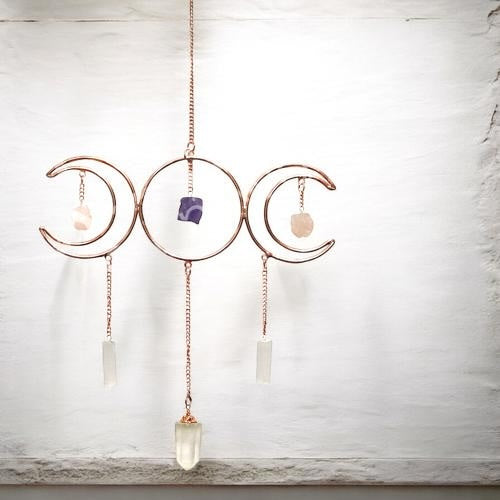 This wire-wrapped copper Triple Moon wall hanging honors the sacred phases of Maiden, Mother, and Crone, bringing lunar wisdom straight into your space. Crafted in warm, glowing copper and adorned with genuine clear quartz, amethyst, and rose quartz, this piece is equal parts statement décor and spiritual powerhouse.