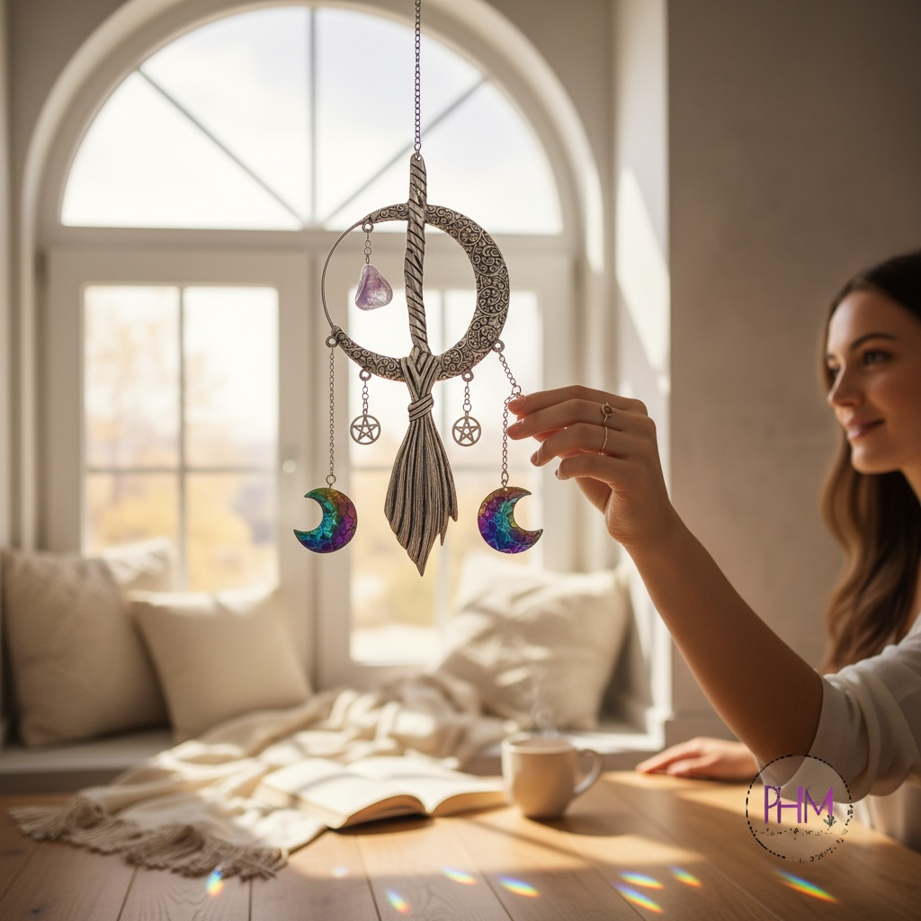 This enchanted silver crescent moon and broom talisman is not just décor. She works. Designed with a delicate silver wire crescent moon paired with a classic witch’s besom, adorned with genuine aura crystals, amethyst, and two protective pentacles, this piece is meant to guard your space while looking effortlessly mystical.