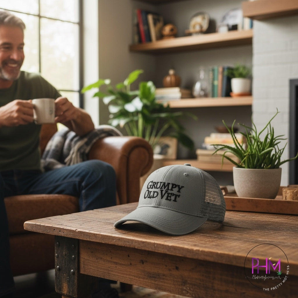 Our Grumpy Old Vet Hat is crafted with the following: