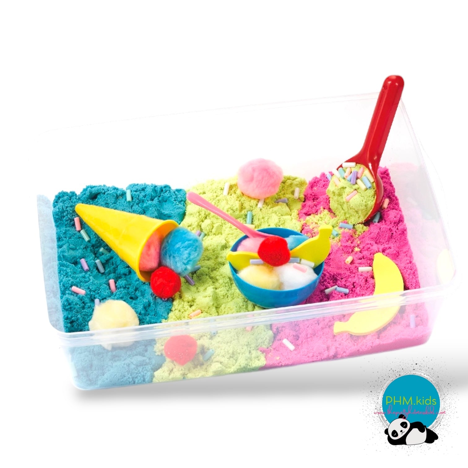Step right up, little ice-cream makers! Pretend you’re running your very own ice-cream shop while exploring textures and colors with sensory sand, pom poms, and rainbow beads. Scoop, pour, and swirl your creations while building fine motor skills and developing sensory awareness.